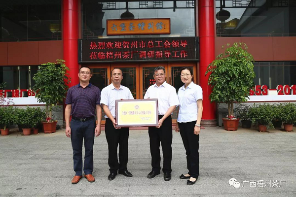 8月29日,賀州市總工會黨組書記、常務副主席莫華鈞(左二),市總工會黨組成員、副主席鐘毅(左一)一行到廣西梧州茶廠對勞模創(chuàng)新工作室和工匠人才等工作情況進行調研,并為該“自治區(qū)勞模和工匠人才創(chuàng)新工作室”授牌…