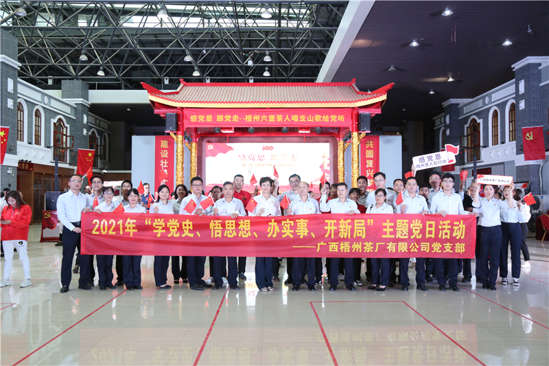 4月26日,梧州市茶產(chǎn)業(yè)發(fā)展服務(wù)中心組織全市茶人、茶企開展題為“感黨恩,跟黨走——梧州六堡茶人唱支山歌給黨聽”的聯(lián)合黨日活動。(廣西梧州茶廠有限公司黨員代表進(jìn)場)